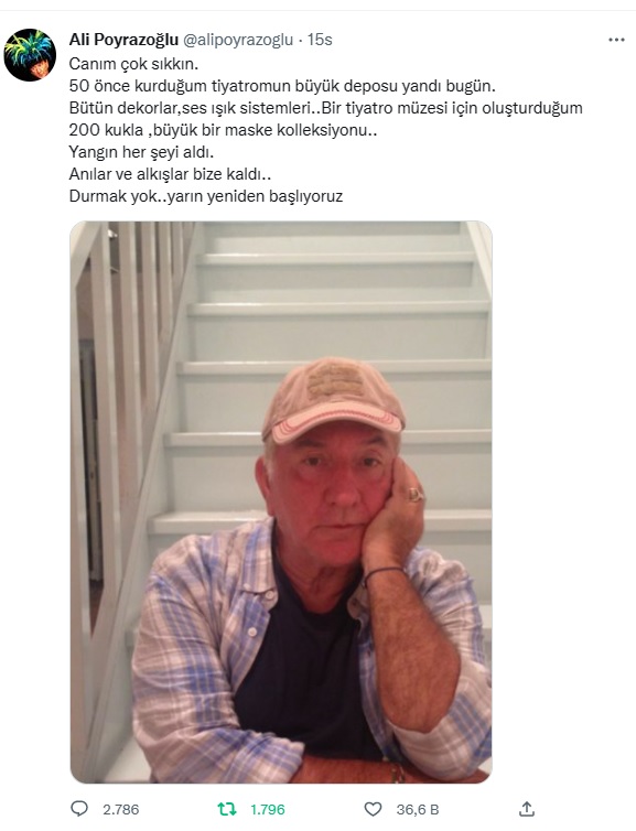 "Canım çok sıkkın. 50 önce kurduğum tiyatromun büyük deposu yandı bugün. Bütün dekorlar, ses ışık sistemleri… Bir tiyatro müzesi için oluşturduğum 200 kukla, büyük bir maske koleksiyonu... Yangın her şeyi aldı. Anılar ve alkışlar bize kaldı... Durmak yok. Yarın yeniden başlıyoruz"