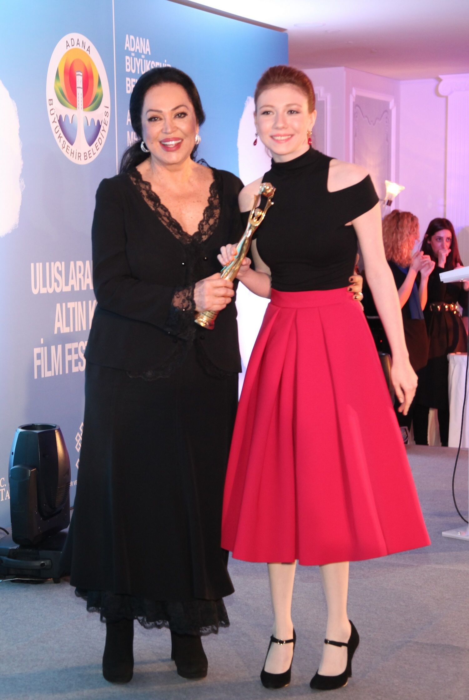 Ece Yüksel, 22. Altın Koza Film Festivali'nden kazandığı ödülü Türkan Şoray'ın elinden alırken.