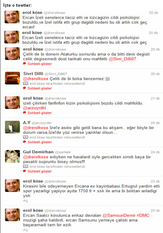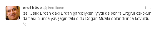 Sivri çıkışlarıyla birçok ünlüyle polemiğe giren müzik yapımcısı Erol Köse, bu kez Ercan Saatci’yi hedef tahtasına yaptı.Köse, twitter’daki sayfasında Ercan Saatci’yi çok kızdıracak açıklamalarda bulundu. İşte o twitler... İzel Çelik Ercan dağıldıktan 20 yıl aradan sonra Beyaz Show da buluştu.