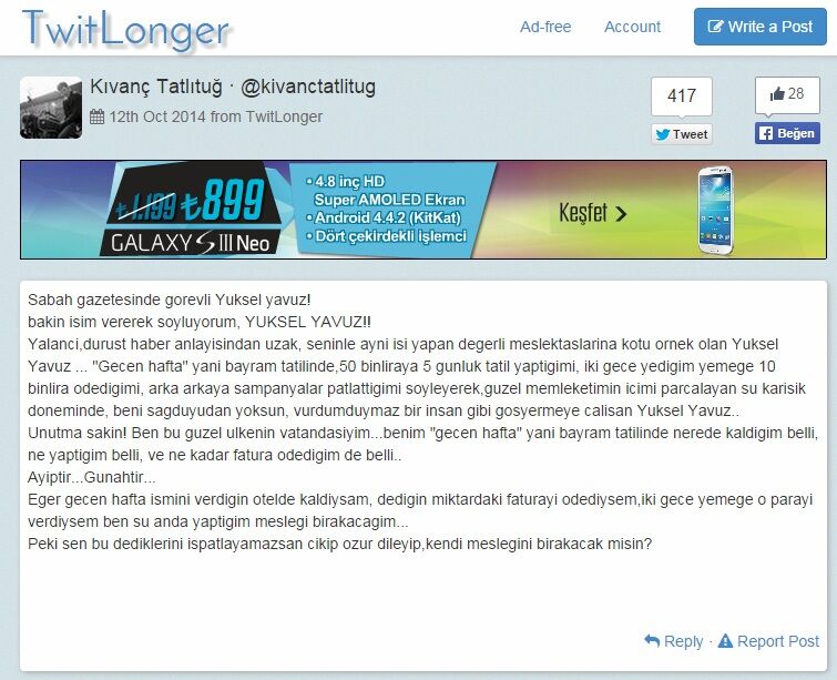 "Geçen hafta yani bayram tatilinde,50 bin liraya 5 günlük tatil yaptığımı, iki gece yediğim yemeğe 10 bin lira ödediğimi, arka arkaya şampanyalar patlattığımı söyleyerek, güzel memleketimin içimi parçalayan şu karışık döneminde, beni sağduyudan yoksun, vurdumduymaz bir insan gibi göstermeye çalışıyorlar."