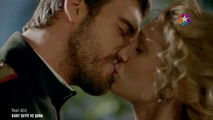 Dizide birbirlerine aşık olan Kurt Seyit ile Şura'nın aşk dolu öpüşmesi geceye damga vurdu.