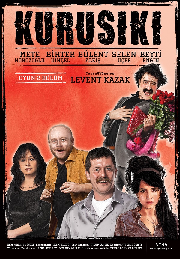 Levent Kazak’ın yazıp yönettiği “Kurusıkı”da; başarılı oyuncular Mete Horozoğlu, Bihter Dinçel, Beyti Engin, Selen Uçer ve Bülent Alkış aynı sahneyi paylaşıyor.