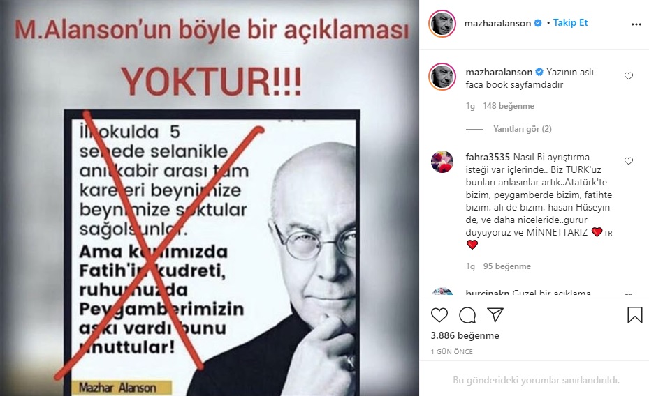 Bu iddialara sosyal medyasından yanıt veren Alanson “Vurun ulan vurun ben kolay ölmem” ifadeleriyle tepki gösterdi. O sözlerin kendisine ait olmadığını belirten sanatçı,“Allah iftiradan korusun. 2018 yılında verdiğim röportajda, ‘Ülkemizin gerçeklerini kabul edersek hepimiz daha mutlu olacağız. Ben mesela, okullarda Atatürk sevgisini otomatikman pek çok çocuk gibi aldım bünyeye. Ama Peygamberime de aşığım, ne var bunda!’ demiştim. Röportajdan bakabilirsiniz ne dediğime. Beni linç ediyorlar” ifadelerini kullandı.