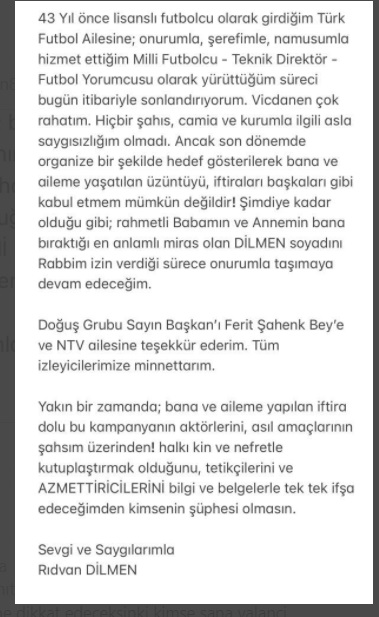 Rıdvan Dilmen'in sosyal medyadan Twitter hesabından yaptığı açıklamanın tam metni şöyle: