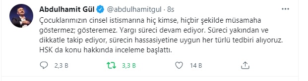 Adalet Bakanı Abdülhamit Gül, Twitter'dan "HSK da konu hakkında inceleme başlattı." açıklaması yaptı.