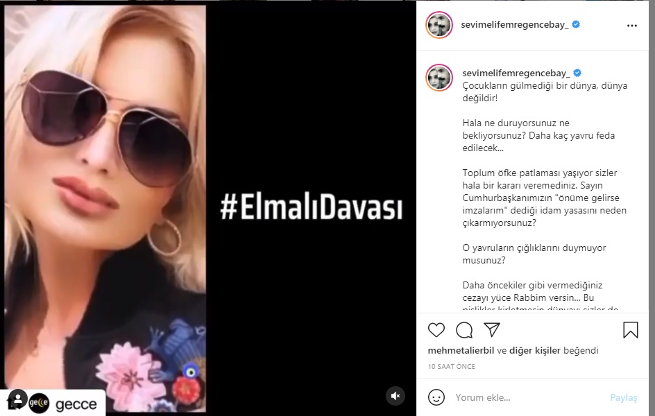 Sevim Emre, gecce'de yayınlanan yazısını #ElmalıDavası hastagh'i ile paylaştı.