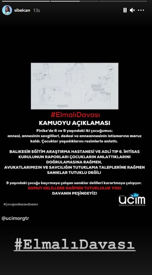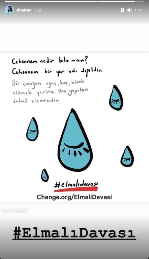 Sibel Can #ElmalıDavası hastagh'i ile; "Cehennem nedir bilir misin? Cehennem bir yer adı değildir. Bir çocuğun ağaç, kuş, böcek çizmek yerine ona yapılan zulmü çizmesidir!" açıklamasını yaptı.