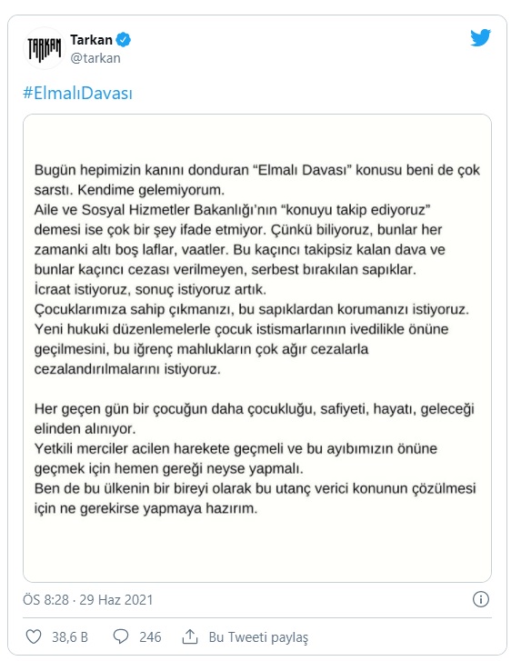 Aile ve Sosyal Hizmetler Bakanlığı’nın Antalya'nın Finike ilçesinde iki kardeşin maruz bırakıldıkları cinsel istismarı resmederek anlattıkları davaya ilişkin yaptığı açıklamaya tepki gösteren sanatçı Tarkan, “Aile ve Sosyal Hizmetler Bakanlığı’nın ‘konuyu takip ediyoruz’ demesi çok bir şey ifade etmiyor. Çünkü biliyorsunuz bunlar her zamanki altı boş laflar, vaatler” açıklamasında bulundu.
