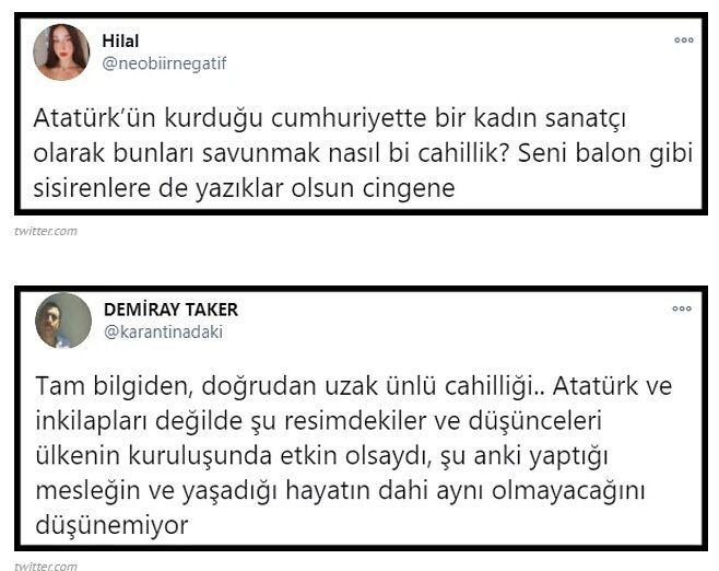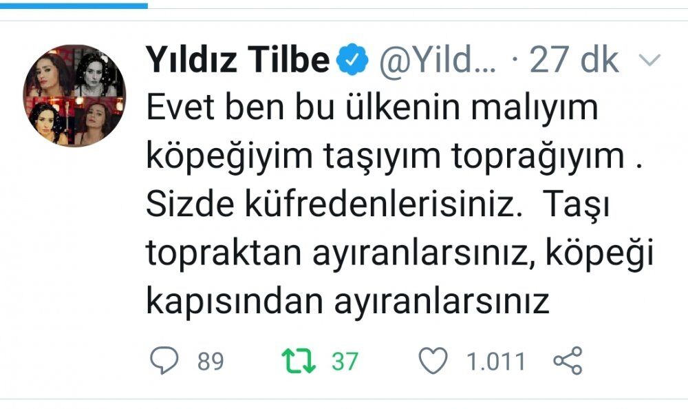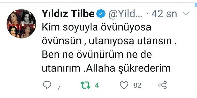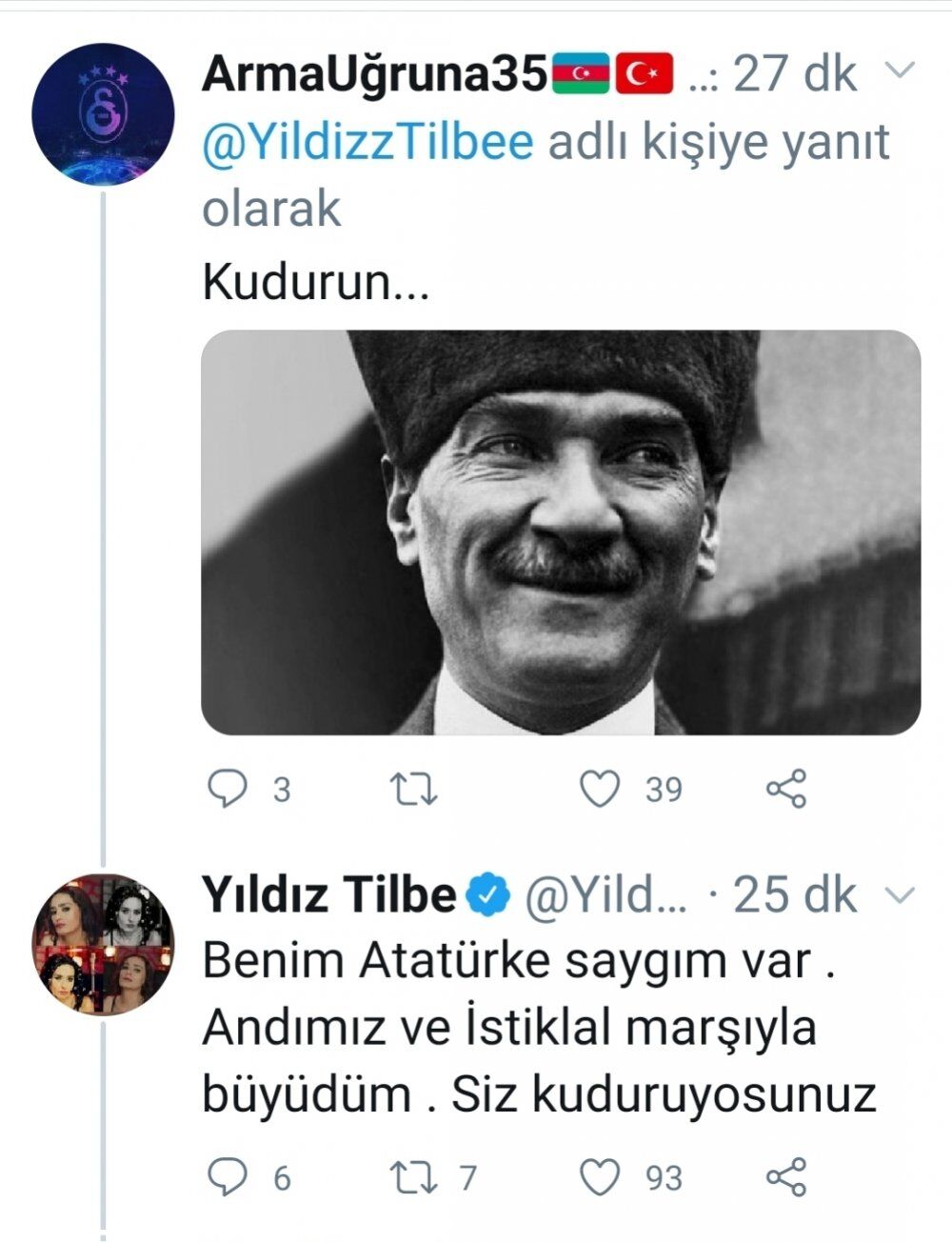 Yıldız Tilbe'ye paylaşımı sonrası tepki yağdı. Bir takipçisinın Atatürk'ün fotoğrafını göndererek; "Kudurun" diye mesaj yazması üzerine Tilbe; "Benim Atatürk'e saygım var. Andımız ve İstiklal Marşı'yla büyüdüm. Siz kuduruyorsunuz" diye yazdı.