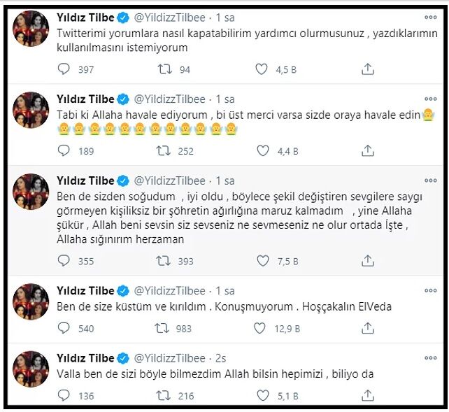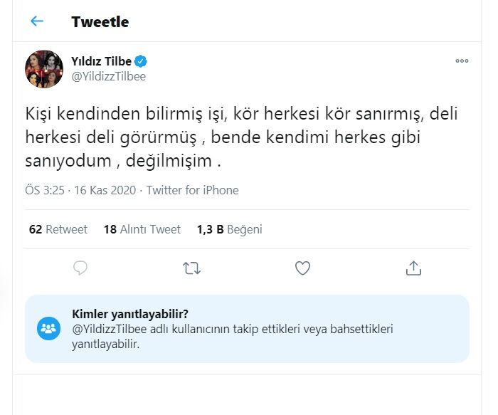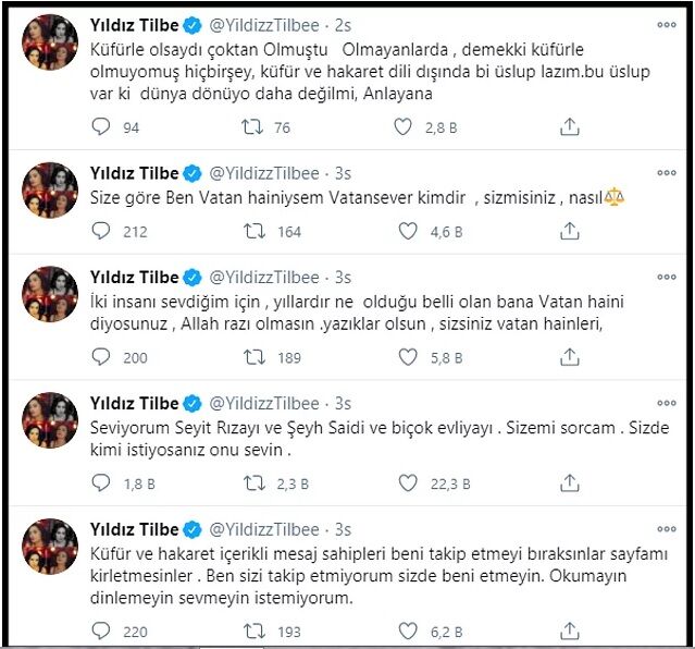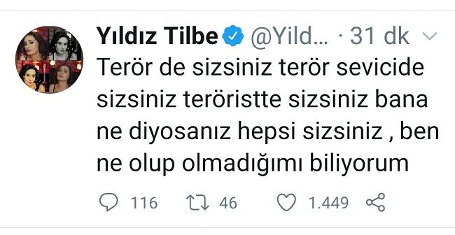 Gün boyunca tweet atan Yıldız Tilbe, tepkilerin artması üzerine bazı tweetlerini yoruma kapattı.