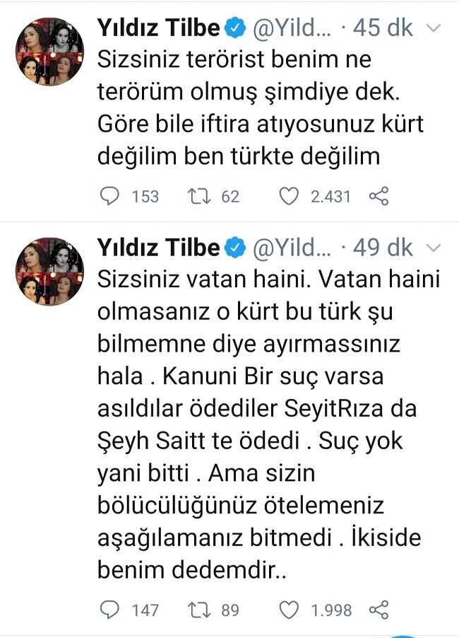 Şarkıcı Yıldız Tilbe'nin Şeyh Saiit ve Seyit Rıza'nın fotoğraflarını yan yana koyarak "Allah'ın rahmeti üzerinize olsun" diye yazması tartışmaları da beraberinde getirdi. Tilbe'nin paylaşımı, sosyal medyada infiale neden olurken takipçileri sosyal medyadan tepkilerini belirtti.